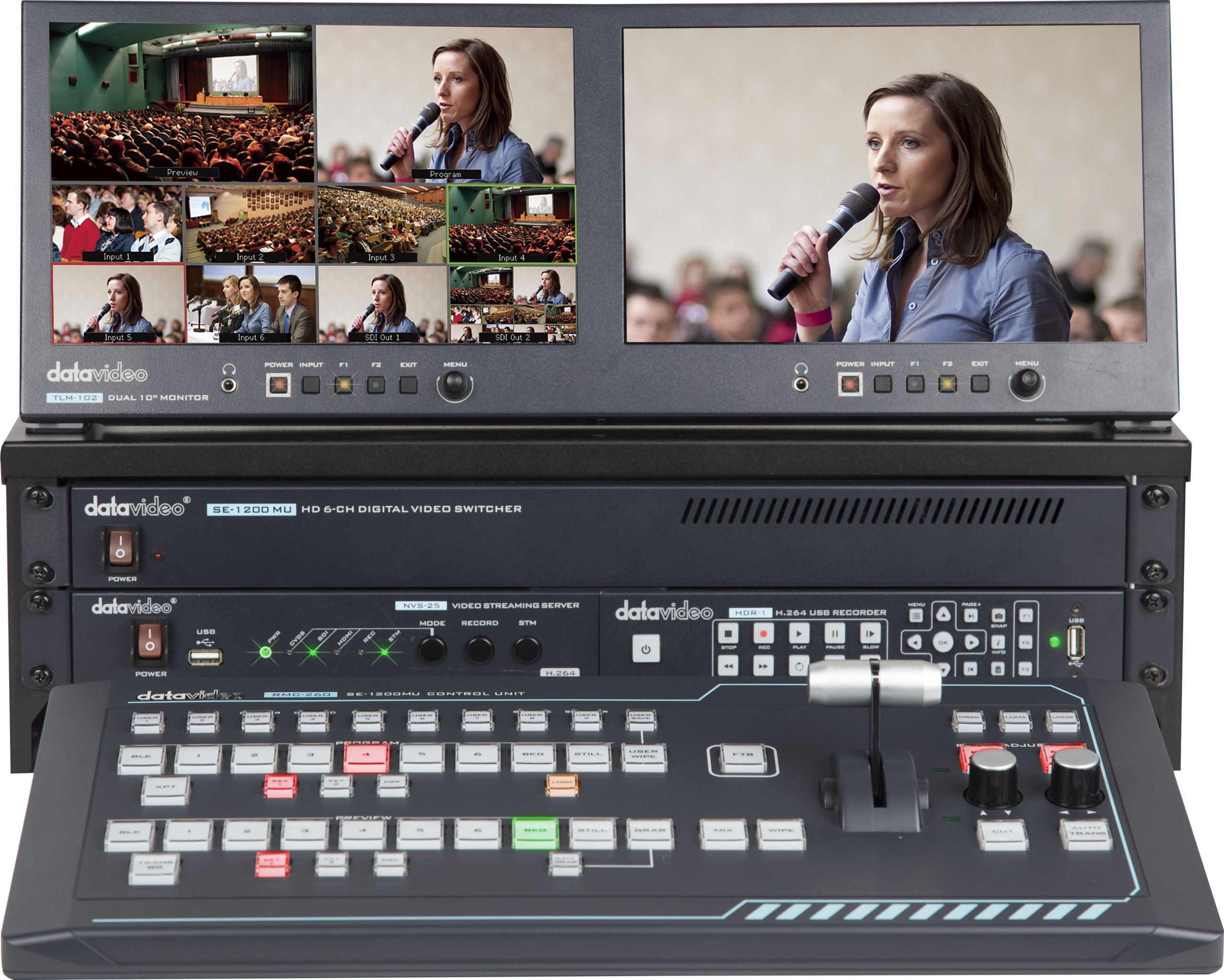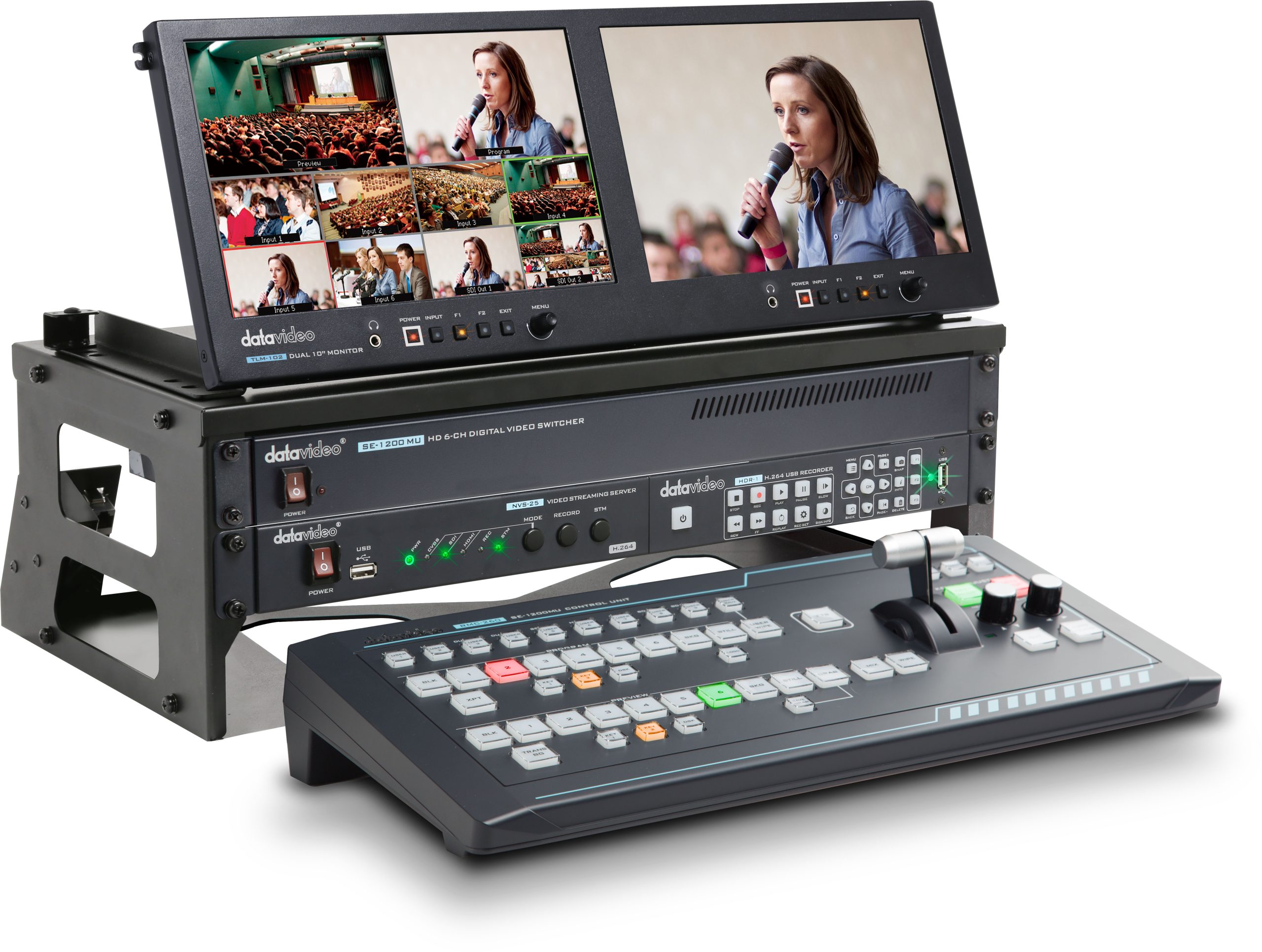 El Go 1200 Studio incluye un conmutador de video con cuatro entradas HD-SDI, dos entradas HDMI, chromakey, luma key y PIP. La configuración también incluye un monitor de pantalla dual, un codificador de transmisión y una grabadora USB. Estos dispositivos se colocan en un estante y se guardan en el estuche incluido, lo que hace que su producción sea profesional y móvil.
