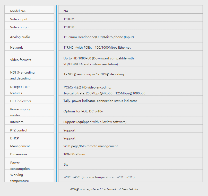 Kiloview N4 for NDI® supports up to HD 1080P60 video input (Encoder) or 1080P60 video output (Decoder). This converter is small and compact enough to put in your pocket with the overall size of 100*80*24mm. It features an HDMI2.0 input and HDMI2.0 loop through for view on the monitor while NDI® streaming, or HDMI 2.0 output while decoding. A tally system with a big tally light is built-in for indicating which camera is in program or preview. It also has the 3.5mm audio input/output which supports intercom (a Kiloview software required).