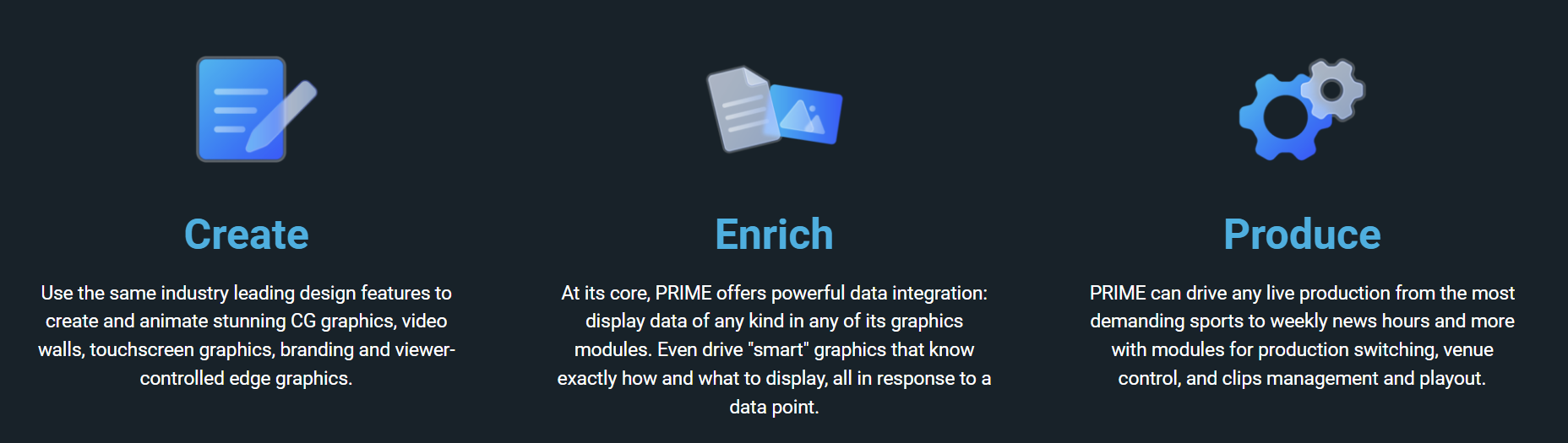 PRIME Platform is a dynamic, scalable, full-featured production engine that bridges legacy workflows with the future of live content creation and distribution. With a comprehensive suite of specialized software modules to address the full spectrum of today’s live production needs, PRIME’s modern architecture easily adapts to market demands for the latest technologies and emerging standards.
