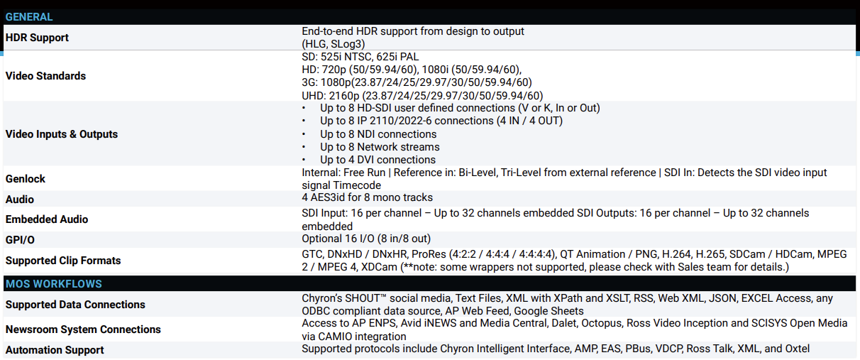 SD, HD, UHD-4K & HDR FORMATS: From input to output, PRIME supports the gamut of SD, HD, and UHD4K formats. Additionally, PRIME maintains an end-to-end HDR workflow (HLG, SLog 3) with builtin SDR & HDR cross-conversion resources to ensure there’s no need to recreate legacy content