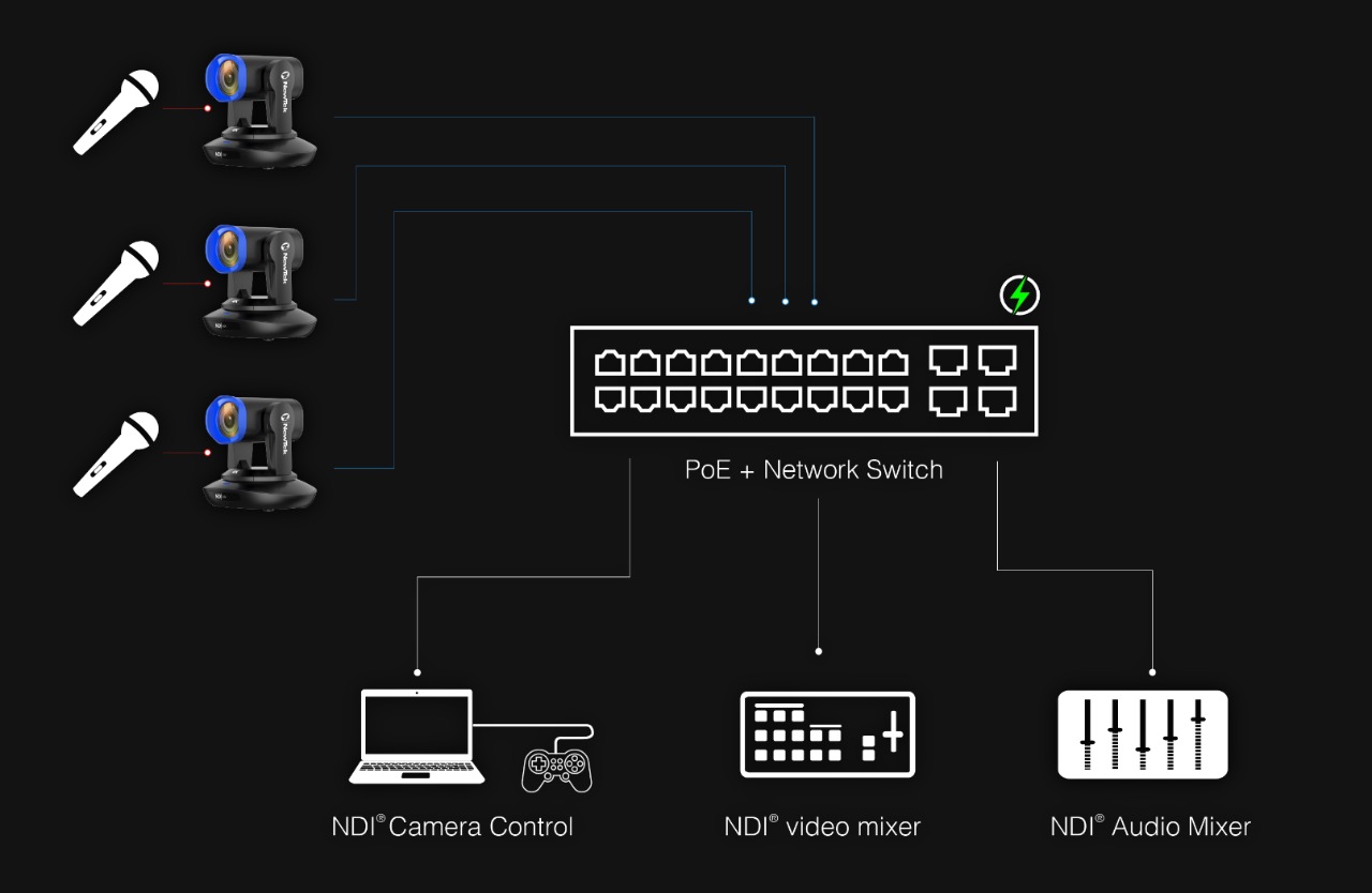 Whether it’s using a single cable for audio and video, PTZ control, tally and PoE for power or connecting via NDI®, NewTek PTZ Cameras simply appear on the network and can immediately be built into any workflow with ease.
