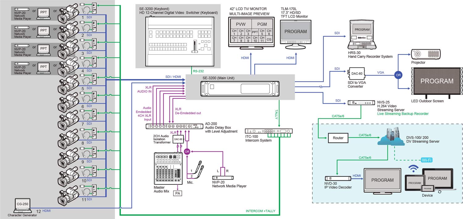 The SE-3200 is a professional 12-channel, 1080p video switcher that provides powerful and easy-to-use video effects such as four upstream keyers for Chromakey and Luma Key, dual DSK, PIP, and WIPE transitions. There are also other features like frame store, animated transition effects, multi-channel inputs, and abundant visual effects. The built-in subtitle generation system can be paired with Datavideo’s CG software to instantly create broadcast quality subtitles.