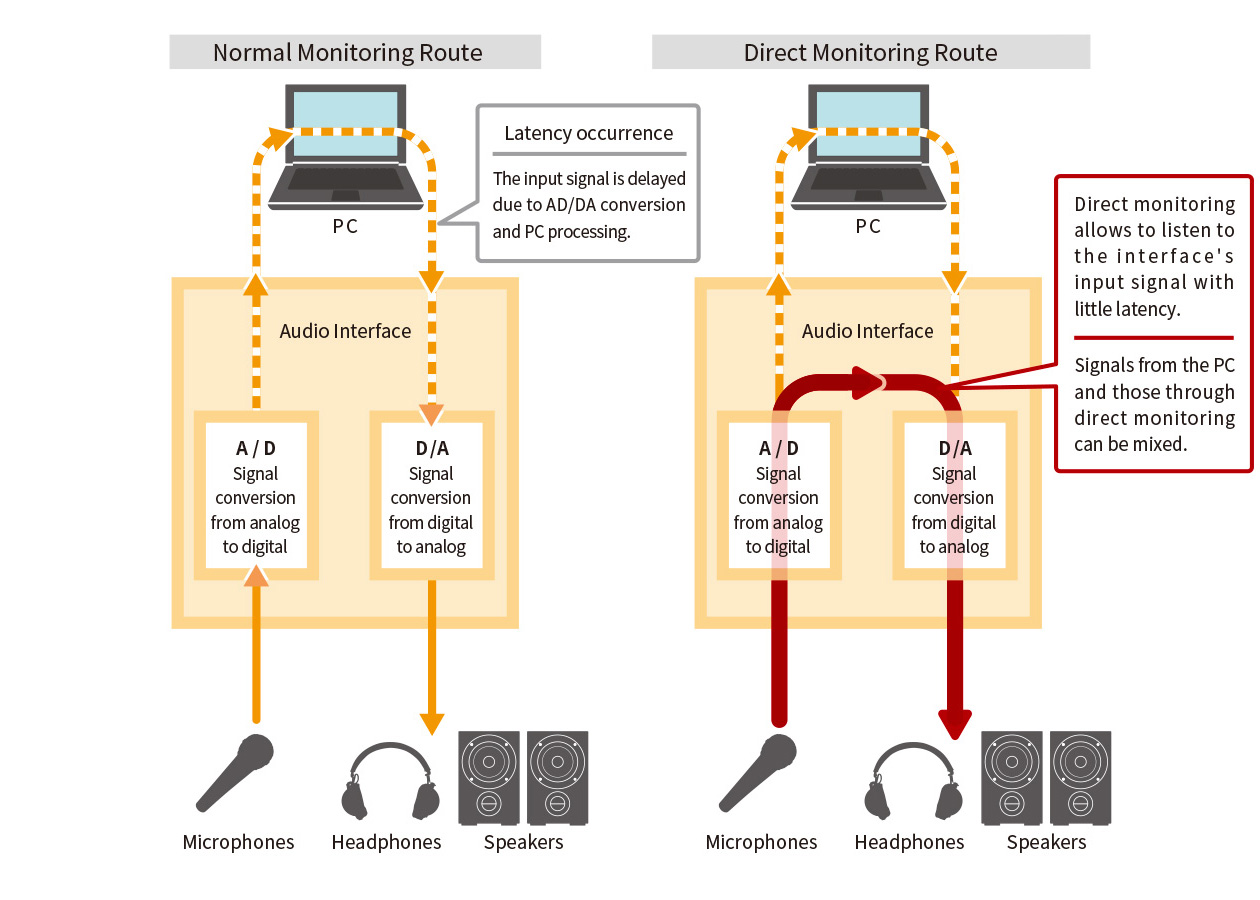 La monitorización directa hará que las señales se desvíen antes de enviarlas a la computadora, lo que dará lugar a un monitoreo fluido y a tiempo, sin ningún tipo de retraso en el sonido tanto durante la grabación como durante la ejecución.