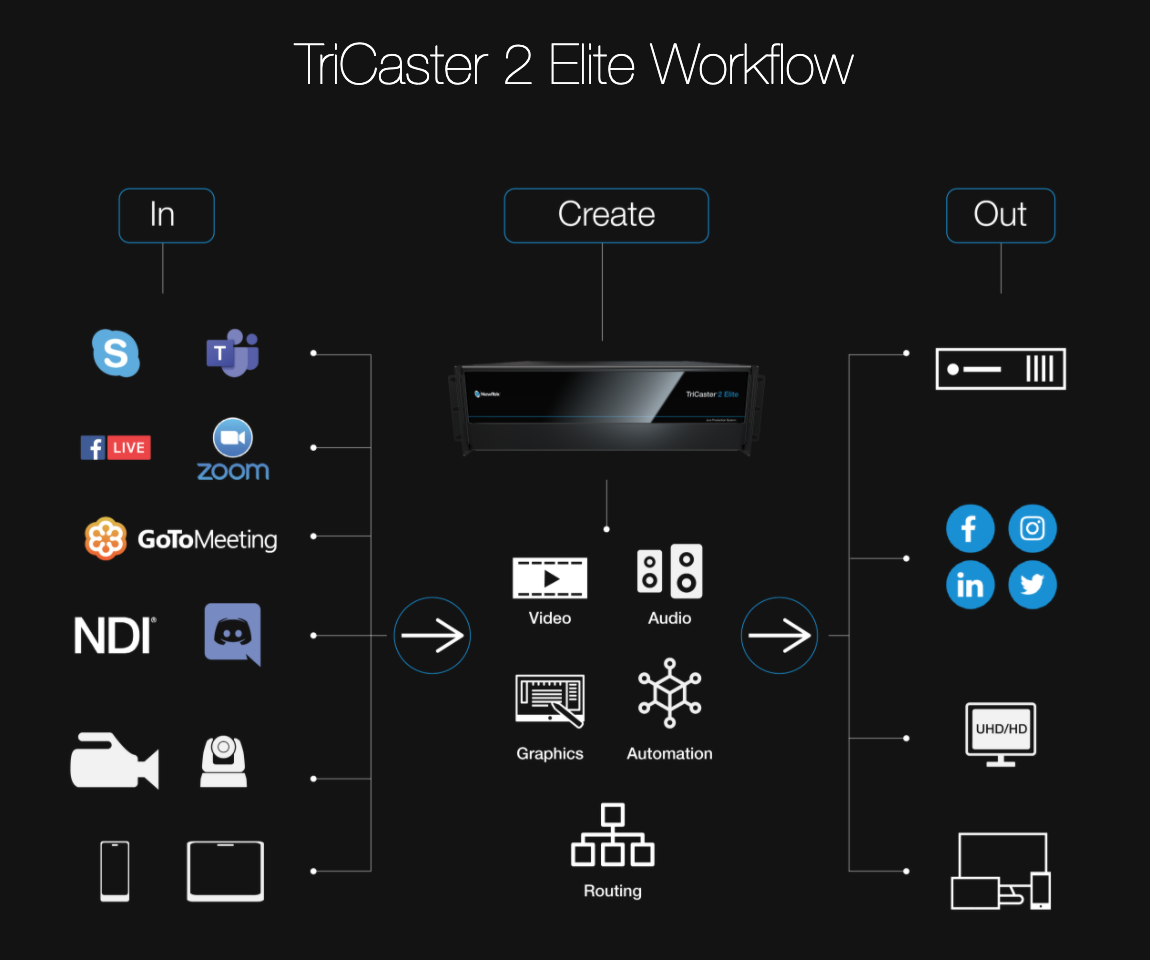 TriCaster 2 Elite es la plataforma de producción de video más completa disponible en la actualidad y establece un nuevo estándar de platino sobre cuánto puede lograr con un solo sistema.