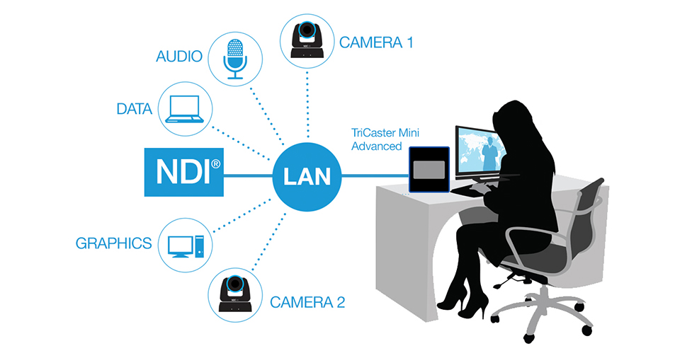 Conéctese al flujo de trabajo basado en IP más prolífico de la industria casi sin instalación previa. Gracias a la integración nativa con NDI™, la innovadora tecnología de Interfaz de Dispositivo de Red de NewTek, TriCaster Mini Advanced es compatible con los productos de cientos de fabricantes y desarrolladores a través de la red.