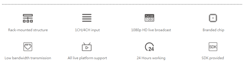 ● RTP/ RTSP/ RTMP/ HLS/ TS/ Onvif/ SIP/ NDI (Customization available) and some other streaming media protocols supported for live broadcast on Facebook, YouTube, Ustream, Twitch, Wowza etc or security platform / NVR system.